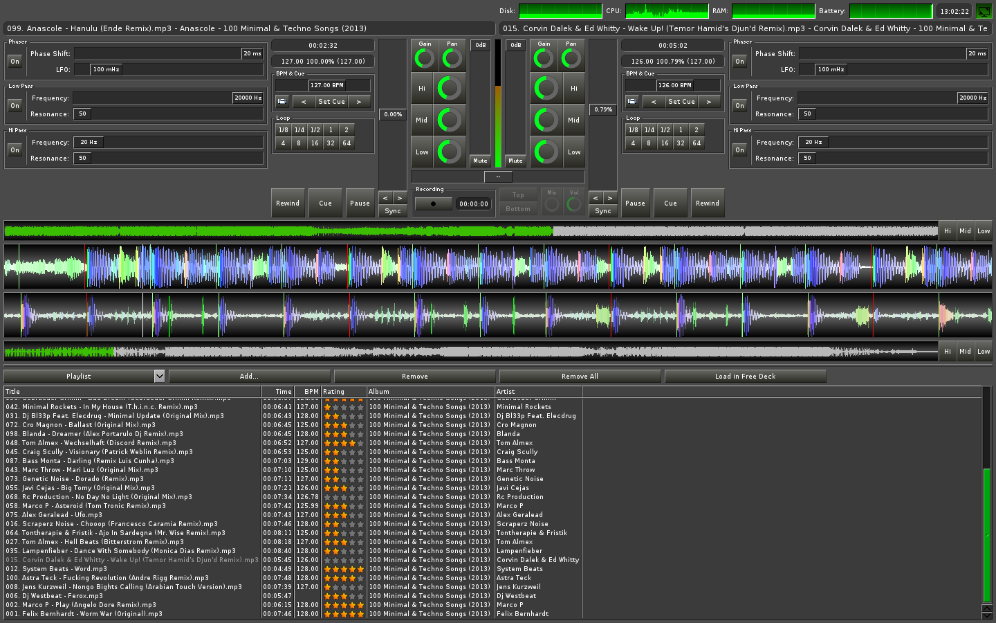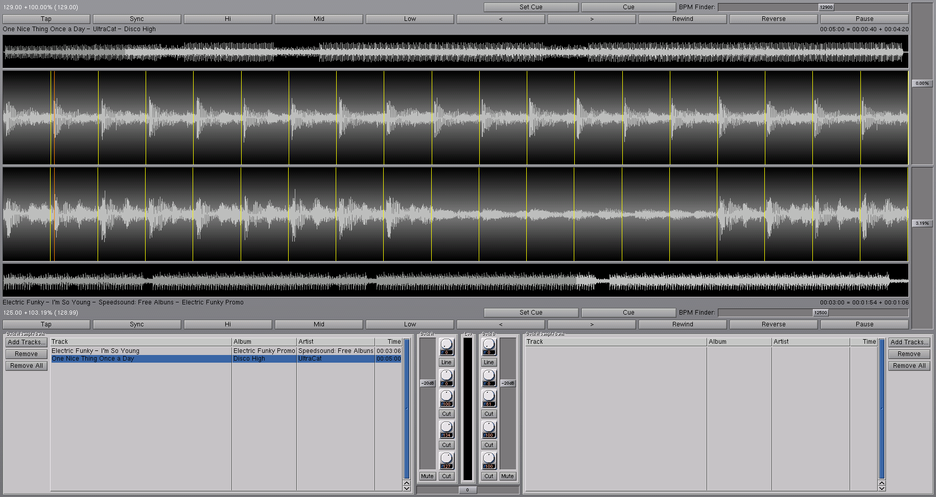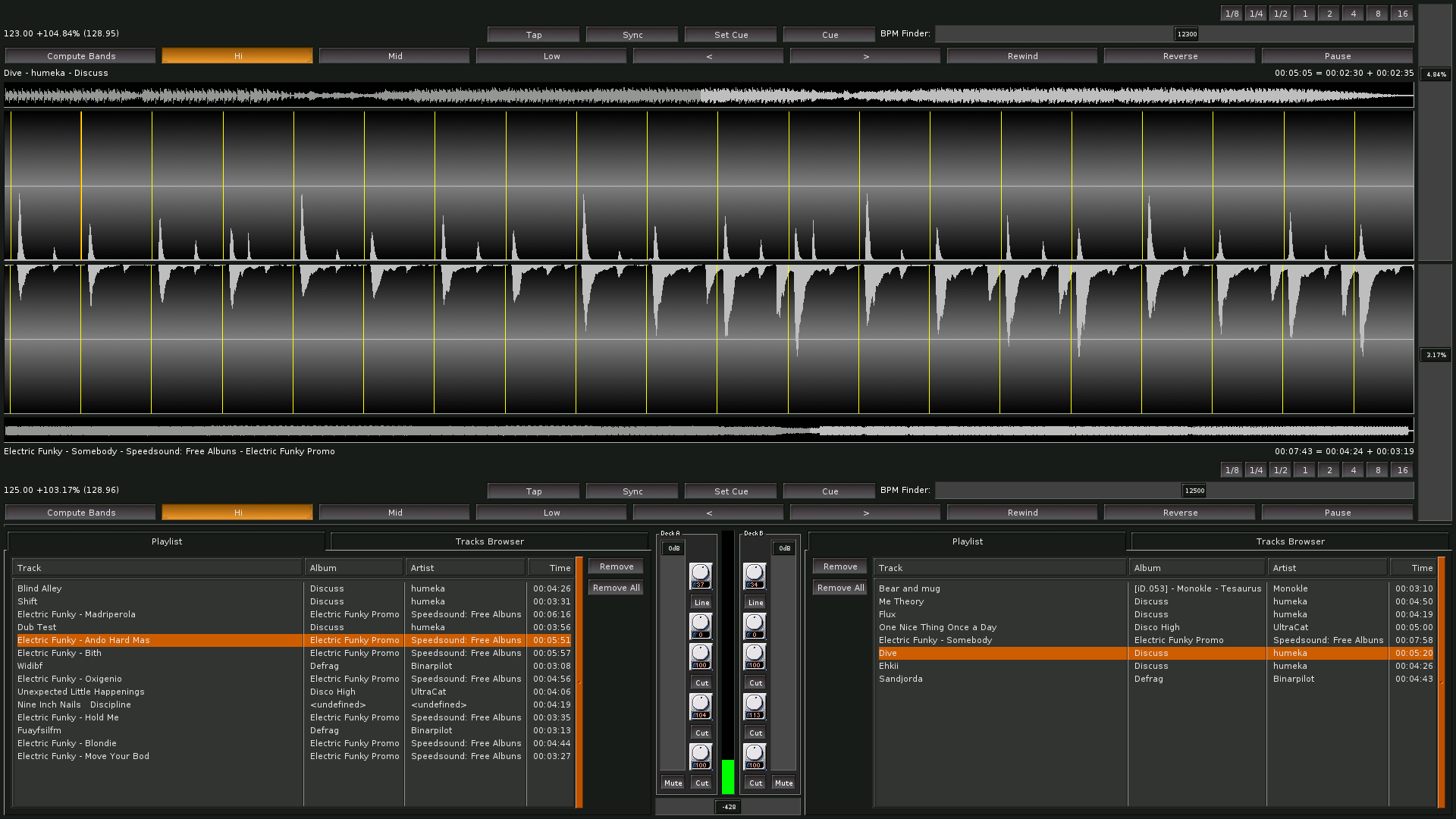 Both decks have been loaded with the Hi/Mid/Low RMS power computation switched on. Samples have been synced using the Hi RMS power band. Sometimes, the sample waveform looks like white noise and no visual information can be used to sync tracks. Here comes in play the Hi/Mid/Low RMS power display feature. Using the information contained in each frequency band, visual syncing is made easier.